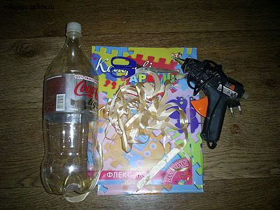 Для того чтобы сделать пасхальную корзинку, мы использовали такие материалы, как пластиковая бутылка, атласная лента, клеящий термпопистолет, ножницы и набор флексики. Бутылку лучше брать такую, где можно вырезать круг пластика с зауженным низом и расширением к верху.