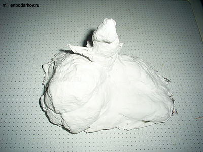 Теперь из нашей бумажной массы лепим поделку. У нас получилась вот такая гора. Оставляем ее сохнуть при комнатной температуре или лучше на батарее. Не пугайтесь, что вид изделия не слишком привлекательный. В процессе дальнейшей доработки гора  станет более ровной и симпатичной.