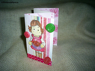 Теперь оформим обложку альбомчика. Для этого наклеим на нее бумагу другой расцветки. Снизу приклеим яркую атласную ленточку. Сделаем компьютерную распечатку куколки-тильды и разукрасим ее акварельными карандашами. Прикрепим три ярких пуговицы. В итоге у нас получается вот такая красота, поделка своими руками.