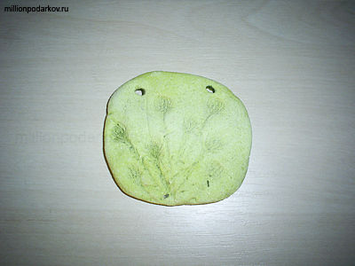 Цветочками или растениями делаем тиснение. Зубочисткой делаем два отверстия.