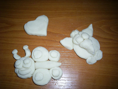 Теперь приступаем к процессу лепки самих изделий. Маленькие детали можно приклеивать разведенным в воде клеем ПВА, чтобы они лучше держались. Готовые изделия сушим при комнатной температуре несколько дней до затвердения. Также для этих целей можно использовать духовку и сушить поделки при температуре около 150 градусов. В последнем случае они приобретут красивый коричневатый оттенок.