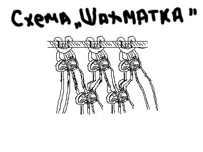 Начинаем плести коврик. Для этого прикрепите к стулу или жердочке нить. Используя метод простой петельки, разместите на ней четное количество вдвое сложенных нитей. Теперь начинайте плести по приведенной выше схеме.