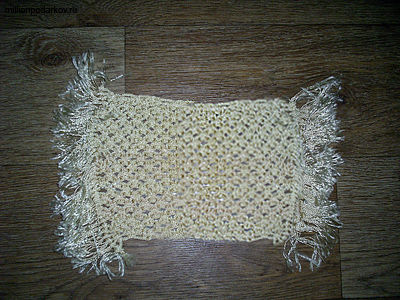 В конце проплетите плотный ряд. Сделайте небольшие отрезы нитей для бахромы и прикрепите их в конце изделия. Вот что у нас получается в итоге.