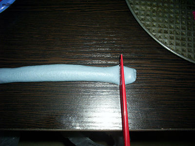 Скатаем колбаску из соленого теста, стеком разрежем ее на одинаковые части.