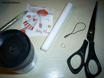 Для того чтобы сделать поделку в виде ангела, мы использовали такие материалы, как пластика белого цвета, салфетку с рисунком, кисточку, ножницы, лак, основу для подвески на мобильный телефон и клей ПВА.
