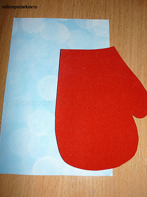 Вырезаем из картона основу для открытки. Из бархатной бумаги вырезаем силуэт рукавицы.