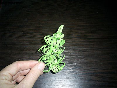 Берем наши заготовки и пальцами сжимаем их с одного края. Из получившихся деталей и складываем нашу елочку. Для этого сначала сделаем плоскую поделку, склеивая по две детали одного размера, постепенно уменьшая их к верхушке. Затем приклеиваем подобные детали с одной стороны под углом в 90 градусов, а затем с другой стороны. Вот что у нас должно получиться в итоге.