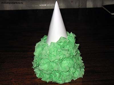 Когда весь конус оклеен салфетками, на вершину елочки приклеить бантик.