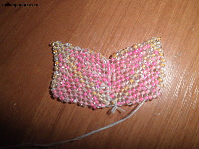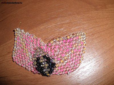 Вплетаем розовый цвет между получившимися промежутками. Последнюю в ряду бусинку делаем белой. Соединяем получившиеся 2 листика