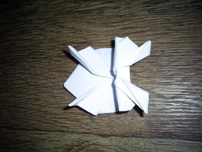 Получившийся прямоугольник складываем еще раз пополам и разворачиваем. Делаем два диагональных сгиба на верхнем квадратике. Складываем два противоположных треугольника друг к другу и накрываем его верхним треугольником. Должно получиться так, как на фотографии.