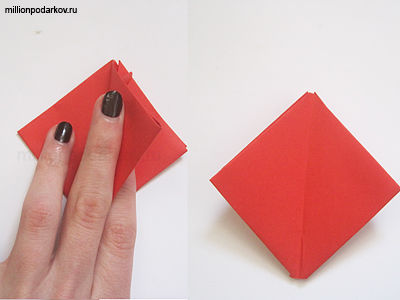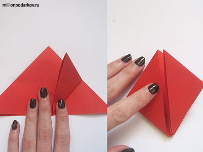 Квадрат из красной бумаги сложить по диагонали. Потом развернуть и снова  сложить по диагонали так, чтобы все углы  были поделены складками.После сложить квадрат из бумаги таким образом, чтоб получился треугольник из бумаги, как на фото.
