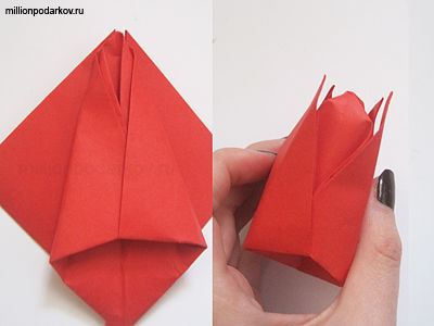 Стороны ромба согните внутрь согласно фото. Стороны накладываются одна на другую. Вложите уголки сторон один в другой. Внизу ромба находится отверстие. Дунув в это отверстие вы  расправите  головку тюльпана. Отогните лепестки вниз.