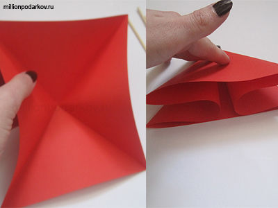 Получившийся ромб разверните так, как на картинке. Для этого нужно каждую сторону сложить внутрь. У нас снова получился ромб, но с ровными сторонами.