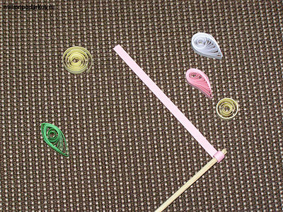 Берем бумагу для квиллинга, наматываем ее на зубочистуку, формируя нужный узор (как показано на фото), закрепляем с помощью клея.