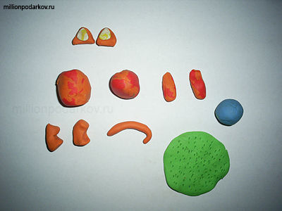 Слепим из оранжевого пластилина голову и туловище, четыре лапки, ушки и хвостик, из синего материала скатаем мячик, а из зеленого сделаем лужайку. Красиво будет смотреться для котика смесь из цветов, а потому если не хватает пластилина, можете смело смешивать 2-3 похожих оттенка.