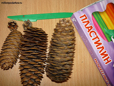 Для того, чтобы у нас получилась поделка баба яга из шишек нам потребуются 2 маленькие сосновые шишки и 3 еловые, пластилин и стек.