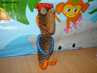 Делаем из пластилина руки, ноги, платок, глаза и рот. Поделка баба яга из шишек готова!