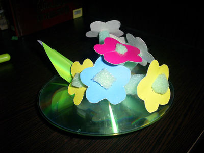 После того, как мы нарезали достаточное количество «стебельков», приступаем к изготовлению самих цветов. Для этого вырезаем из цветного картона чашечки цветов и делаем посередине отверстие. Вставляем стебелек-губку. Из зеленого картона вырезаем листочки. Всю получившуюся композицию протягиваем сквозь отверстие в диске. Для этой поделки даже не нужен клей. Все прекрасно держится и без него. Вот что у нас получается в итоге.