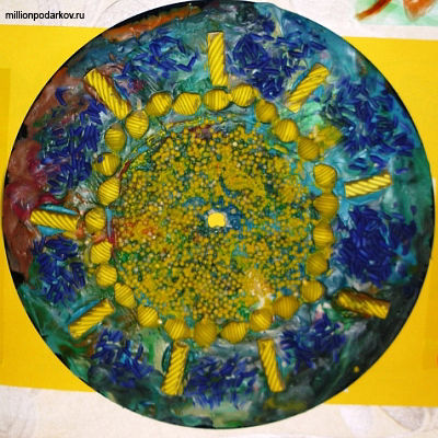 Выложите вместе с ребенком из крупы и макарон солнышко. Кружок выложте макаронами ракушками, лучики сделайте из макарон трубочек, а в середину солнышко насыпьте желтое пшено и гречку, рисом покройте всю оставшуюся свободную площадь. Затем раскрасьте изделие красками и готово!