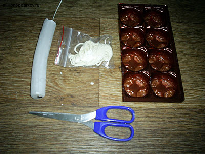 Берем внутреннюю упаковку из-под конфет, заливаем в ее ячейки жидкий парафин и вставляем кусочек фитиля. С помощью ножниц или любых других подручных средств закрепляем фитилек на месте, до тех пор, пока свеча не застынет.
