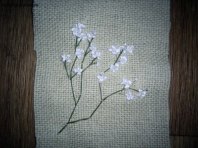 Теперь приступаем к вышивке. Для этого нам понадобятся нитки мулине зеленого цвета и тонкие белые атласные ленточки. Сначала вышиваем стебелек. Для начала нитки мулине протираем мылом, смоченным водой. Основу стебелька делаем в четыре нити, затем закрепляем их с изнанки и продолжаем вышивать стебель уже в две нитки. Ответвления делаем в одну нить. Получается вот такая веточка.
