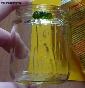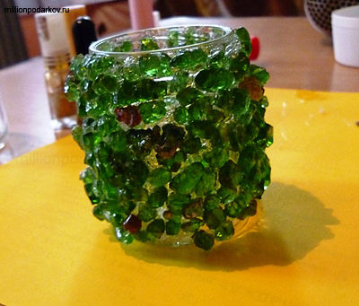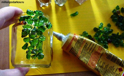 Приклеиваем стекло на одну сторону банки. Стараемся разместить частички, как можно ближе друг к другу.