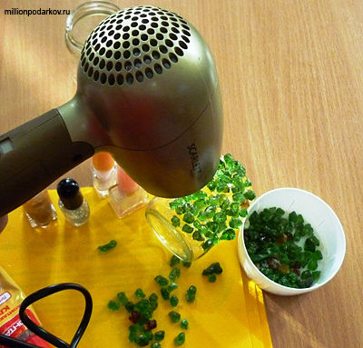 Обклеиваем банку со всех сторон стеклом, а на горлышко наносим слой лака для ногтей.