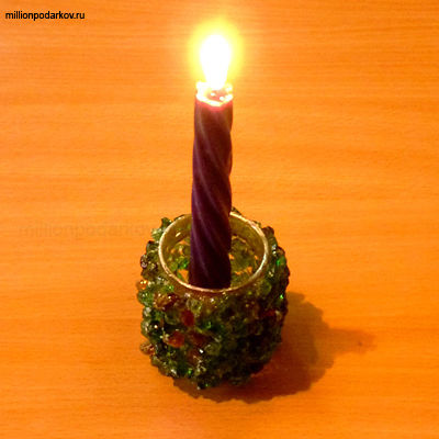 Приступим к изготовлению нашего подсвечника. Нам потребуется дроблёное цветное стекло, клей, стеклянная банка от детского питания и лак для ногтей. Наша задача украсить банку цветным стеклом, посадив кусочки стекла на клей. Это придаст банке особый необычный вид с оригинальным рельефом. А лак нам потребуется для того, чтобы раскрасить горлышко банки. Так же я в своей работе использовала фен, для более быстрого высыхания клея.