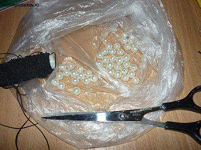Отрезаем 40-50 см резинки. Нанизываем три бусины на резинку. А в четвертую бусину, продеваем два конца резинки навстречу друг-другу.