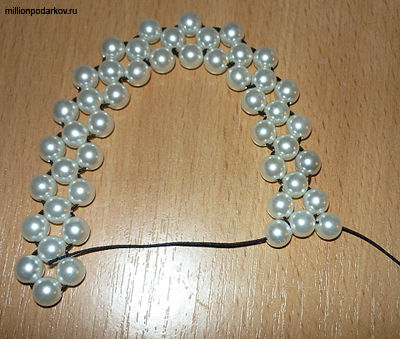 Нанизываем на два конца резинки по бусине. Затем нанизываем ещё одну бусину и продеваем в неё оба конца резинки навстречу друг другу.