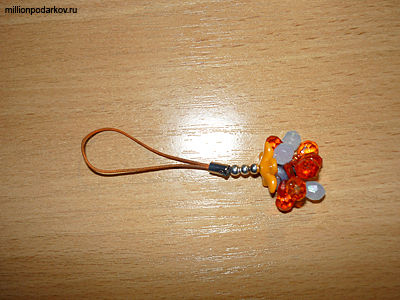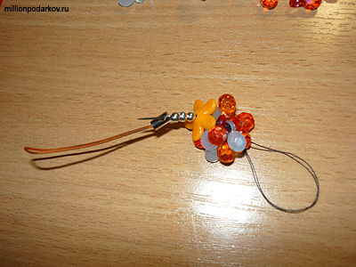 Нанизываем ещё 5 бусин. Затем сверху нанизываем бусину в виде цветка. А затем на нитку одеваем 3 бусины серебряного цвета. После этого продеваем иголку в крепежные отверстия шнурка для телефонных подвесок.