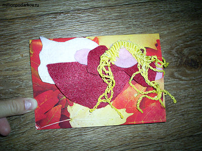 Черным маркером нарисуем глаза, рот, нос, брови. Вот такая чудесная аппликация на открытке у нас получилась в итоге. Можете подарить ее близкому человеку к Рождеству или на день Ангела.