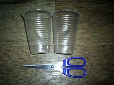 Для изготовления поделки подготовьте два одноразовых пластиковых стаканчика и ножницы.
