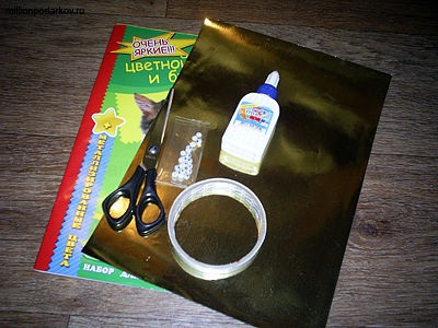 Для того чтобы сделать открытку, подготовьте такие материалы, как цветной картон, металлизированную цветную бумагу, клей ПВА, двухсторонний скотч, ножницы, готовые глазки, пластилин.