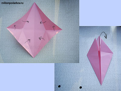 Намечаем все диагонали и линии, как видно на рисунке. Складываем базовую фигурку на втором фото. Для этого сначала загибаем верхние стороны, затем нижние, а затем углы по бокам. Верхняя задняя половинка загибается вниз (см. второе фото).