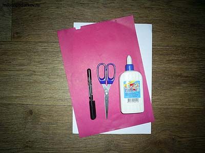 Для изготовления поделки подготовьте лист белой бумаги и лист бумаги розового цвета. Также нам понадобятся ножницы, клей, черный маркер.