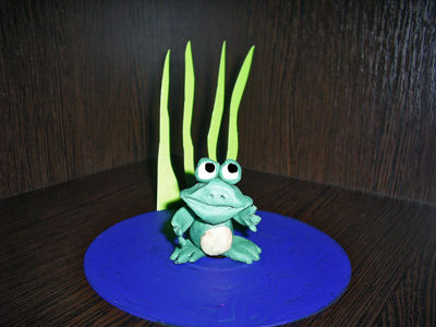 Складываем лягушку из отдельных элементов, делаем из пластилина белки и зрачки глаз. Теперь посадим нашу жабку на озеро. Вырезаем из картона зеленого цвета травинки и приклеиваем их снизу к диску. Вот такая замечательная поделка у нас получилась в итоге.