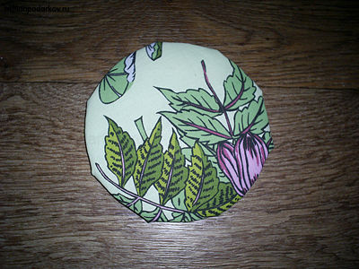 Для того чтобы сделать подставку под горячее, мы использовали такие материалы, как диск, ткань, ножницы, двухсторонний скотч и синтепон.