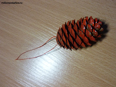 Делаем петельку из нитки, для того чтобы игрушку можно было повесить на ёлку. Отрезаем 20-30 см нитки, складываем её пополам, для прочности. Затем аккуратно просываем нитку под чашуйки в основании шишки, завязываем нитку. Ниточку для прочности покрываем лаком.