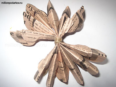 Поочередно загибаем внутрь все лепестки. Наши поделки из газеты готовы!