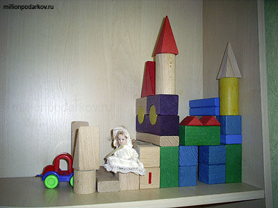 Строим из конструктора замок, город или деревню. У нас получился вот такой средневековый замок. Такая игрушка не занимает много места, ведь сделана она на одной из полок в шкафу. Таким вот образом можно попросту хранить деревянный конструктор.