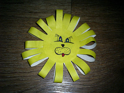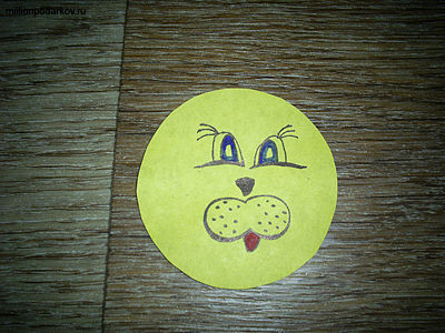 Теперь делаем голову львенка. Для этого вырезаем из желтой цветной бумаги еще один круг. Рисуем или вырезаем из бумаги глаза, нос, рот и усы. Приклеиваем все это к мордочке львенка.