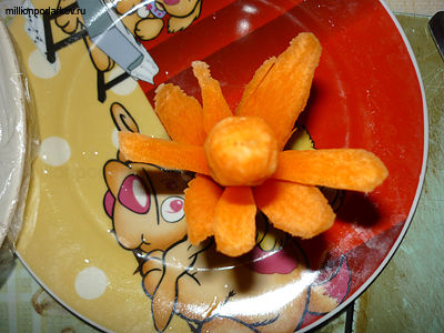 Оставшуюся часть морковки режем ножом крест накрест. Затем с помощью ножниц придаем более правильную форму для лепестков. Всё, поделка готова!