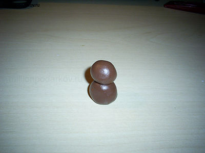 Добавляем лапки, мордочку и ушки из бледно-коричневого пластилина. Делаем красное сердечко и черный носик. Стеком формируем глазки и ротик. Варим 15 минут или запекаем в духовке.