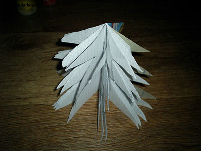Теперь разворачиваем поделку, формируем из нее объемную елочку. Силуэт елки вырезать проще, если делать это с каждой половинкой блокнота по очереди.