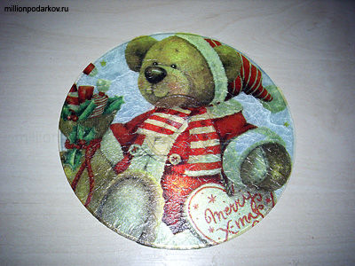 Для начала промазываем клеем ПВА диск. Его слой должен быть тонким и ровным. Отделяем от салфетки верхний красочный слой и аккуратно, разглаживая складки, приклеиваем его к диску.