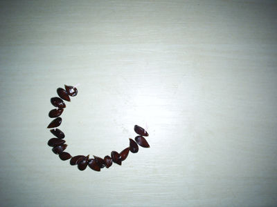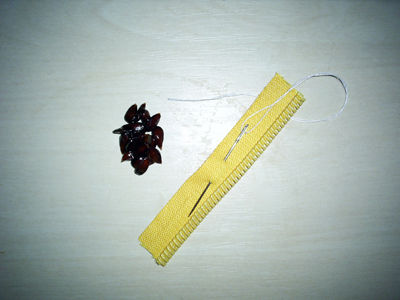 Итак, берем разбухшие в воде яблочные зернышки и выкладываем их на салфетку, чтобы они немного обсушились. Теперь, накалывая их посередине, нанизывайте зернышки на леску или нитку.