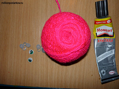 Для поделки нам потребуются яркие нитки для вязания, клей "Момент", ножницы, декоративные глазки, атласная лента, небольшой кусочек бумаги и бусины с большим отверстием.