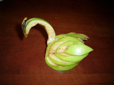Поделки из овощей и фруктов могут делать и дети и взрослые. Готовые изделия могут стать украшением праздничного стола, позволяя вашим гостям полюбоваться на произведения искусства. Кроме этого, поделки из овощей и фруктов очень хорошо делать для детей, которые не хотят съедать их целыми. Из этой статьи Вы узнаете о процессе изготовления яблочного лебедя.