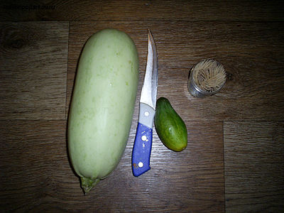 Для того чтобы сделать поросенка, мы использовали такие материалы, как кабачок, огурец, зубочистки и нож.